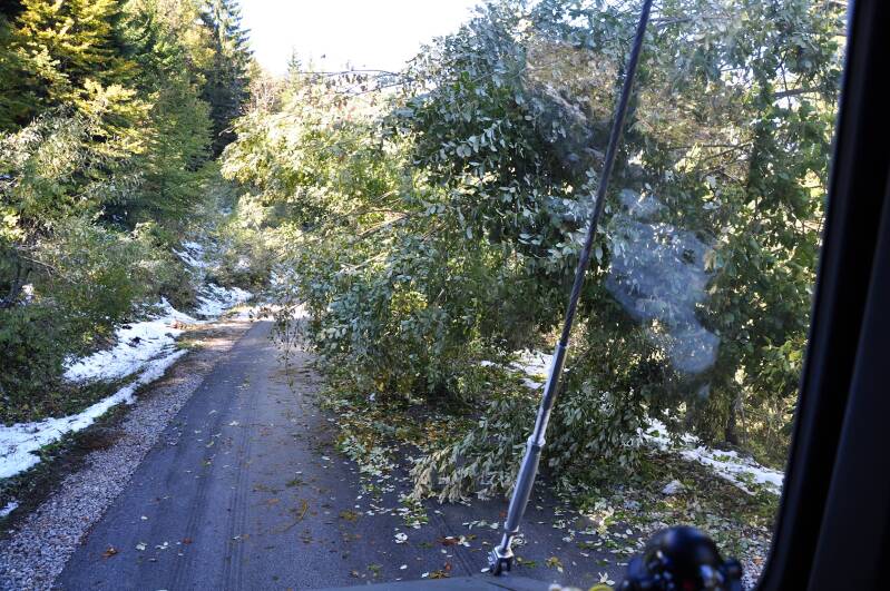 Die Fahrt führt durch endlose Mischwälder und neu auch vorbei an unzählige Himbeer-Plantagen. Da es vor rund zwei Wochen bis in tiefe Lagen geschneit hat, liegen links und rechts der Strasse unzählige abgebrochene Bäume und Äste.