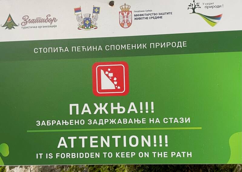 Nach dem Morgenkaffee starten wir zur Stopić Höhle. Die Rezessionen der Höhle haben uns angesprochen und klangen interessant. Die Übersetzung am Hinweisschild hat wohl nicht ganz geklappt. Wir können uns nicht vorstellen das "Achtung!!! Es ist verboten auf dem Weg zu bleiben" gemeint ist.