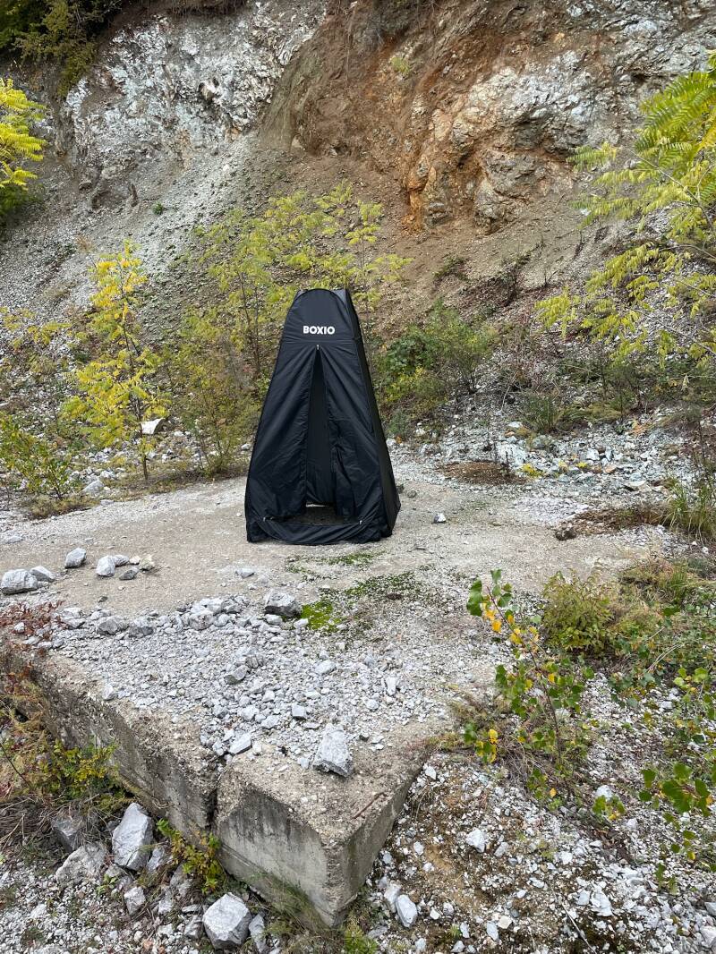 Die nächsten 30 km sehen wir die grösste Ansammlung von Holzlastwagen. Später wechseln wir auf die Strasse E-761. Die Strasse ist breit, gut unterhalten und wir fahren wieder mal 80 km/h. Angekommen an der Festung Maglič sehen wir den Zeitplan der kleinen Fähre über den Fluss. Bis 1600 Uhr müssten wir warten und dann ist es bald dunkel. Wir fahren hoch zu einem kleinen Steinbruch und machen es uns gemütlich. Unser Duschzelt ist hervorragend und einfach aufzustellen - es springt von alleine auf - ABER das zusammendrehen, legen, falten - ist immer etwas schwierig. Gerli sagt so - heute mach ich das aufs erste Mal und voilà, das macht sie tatsächlich.