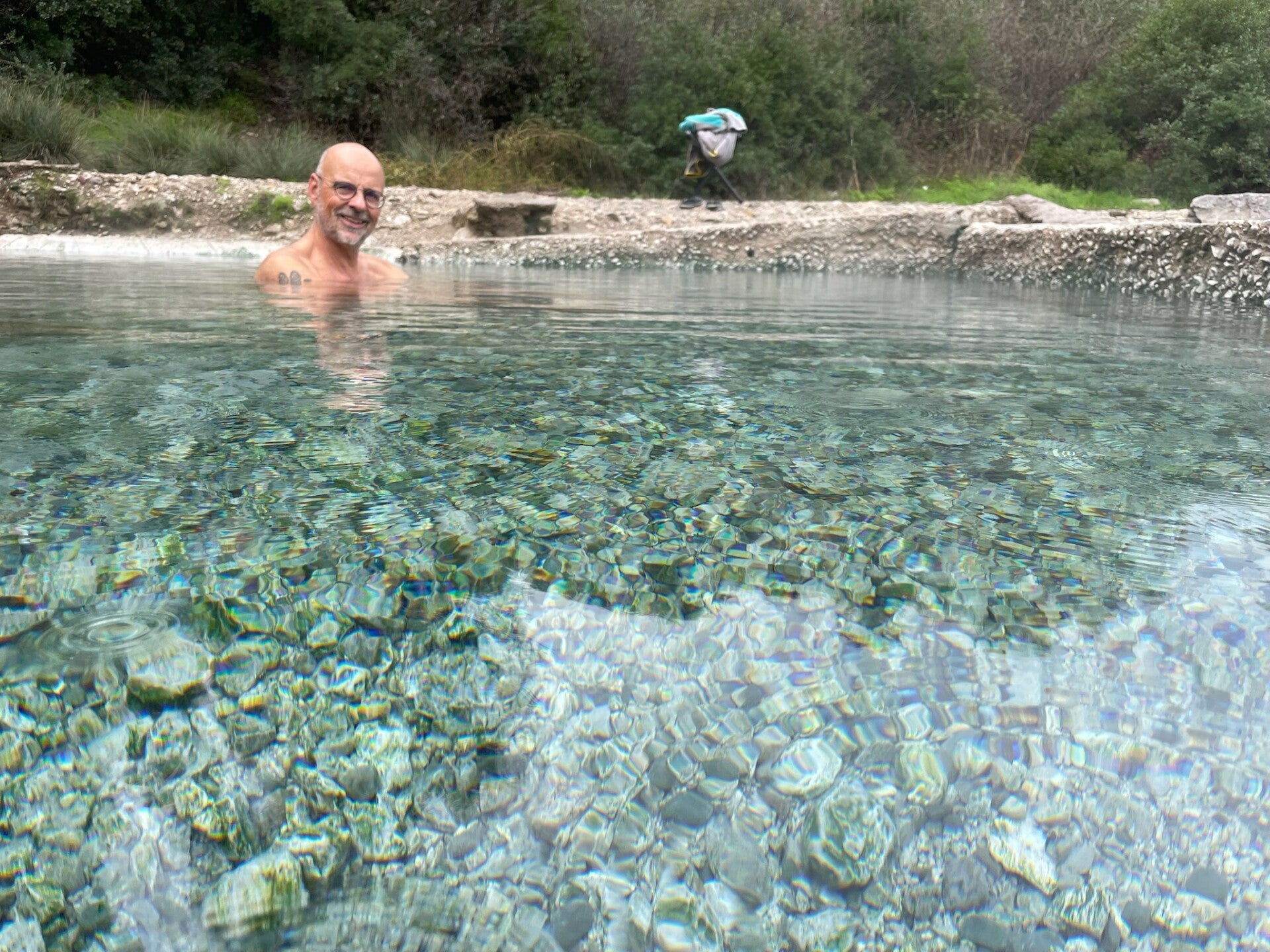 Am Morgen setzt leichter Regen ein. Martin testet die grosse Quelle und misst 34 °C. Für ein Morgenbad vielleicht etwas zu kalt für Gerlinde und so fahren wir schnurstracks zurück zum 40 Grad Pool. Poah, wie herrlich das doch ist 🤩😆!