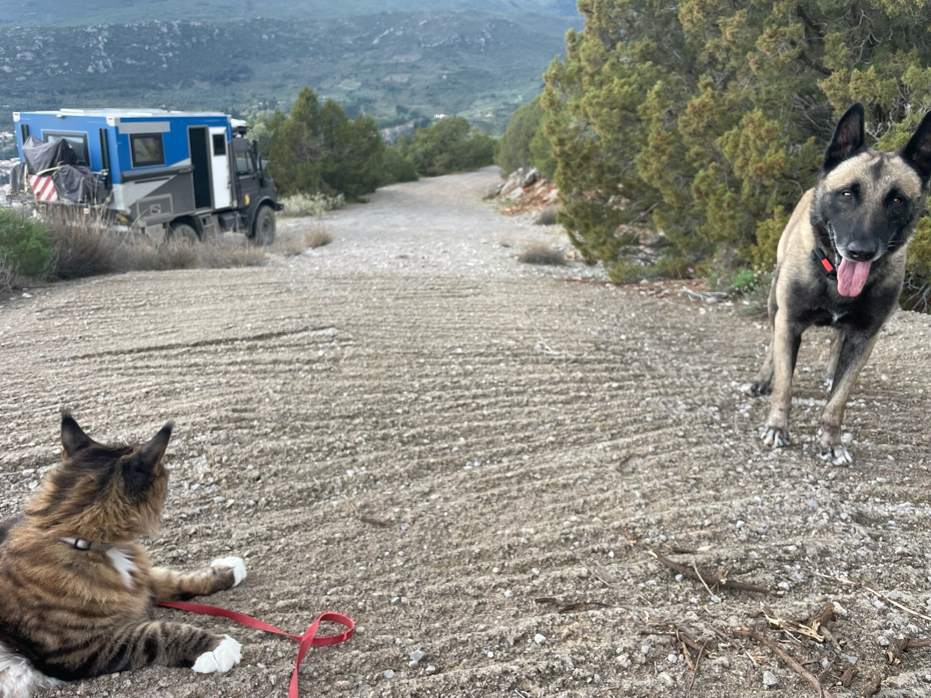 Nach einer verregneten Nacht freuen wir uns über die Vormittagssonne. Gerlinde ist noch am bearbeiten vom letzten Bericht, hört sie ein plätscherndes Geräusch 🤔. Beim Blick nach draussen - da schlabbern doch tatsächlich zwei Jagdhunde Aeros Wassernapf leer 😂. Der Blick über die Hügelwelt ist wunderschön.