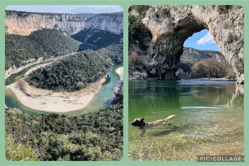 Die Ardèche-Schlucht sowie der berühmte Bogen Pont d'Arc sind sehr eindrücklich. Aero nimmt ein grosszügiges Bad, uns ist es noch zu kalt 🥶. Gerne wären wir die 32 km unter dem Bogen und durch die Schlucht gepaddelt. Mit unserem Faltboot hatten wir Sorge es zu vernichten, auch die Rückkehr zum LKW ist in der Vorsaison eine logistische Herausforderung. Ein Kajak leihen, inklusive Transport ist hier die tolle Alternative - wäre es nicht März sondern April 🤷♀️. Die gesamte Maschinerie für den Tourismus ist noch im Wintermodus. Wir nehmens mit Humor und geniesen den tollen Tag!