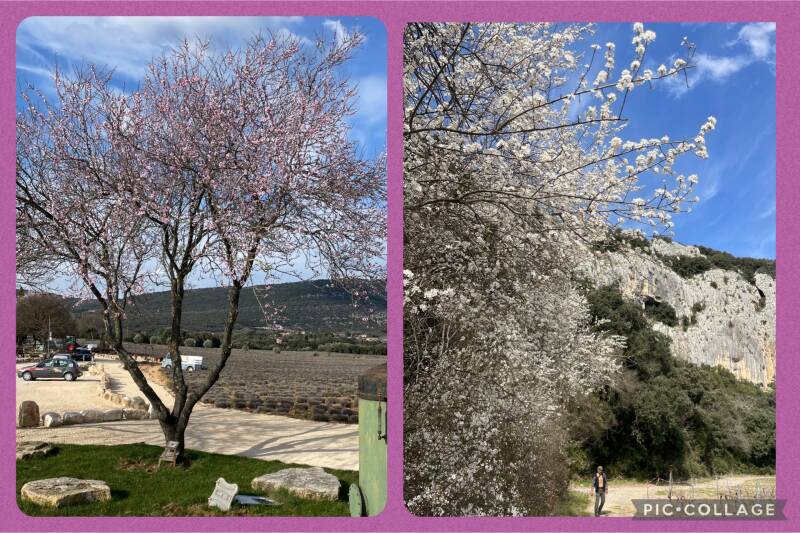 Die Blüten der Mandelbäume strahlen in der Sonne, unser nächstes Ziel ist der berühmte Bogen Pont d'Arc am Fluss Ardèche. Den Touristenort Vallon-Pont-d'Arc, der im Hochsommer mehr als 5000 Paddler durchschleust, erreichen wir diesen Abend nicht mehr ganz. Eine grössere Umleitung bremst uns aus und wir übernachten auf einer Hochebene, mit frischen Spuren von Wildschweinen 🐗. Das am Weg liegende Lavandelmuseum sieht sehr einladend aus, öffnet leider erst im April, wie so vieles hier.