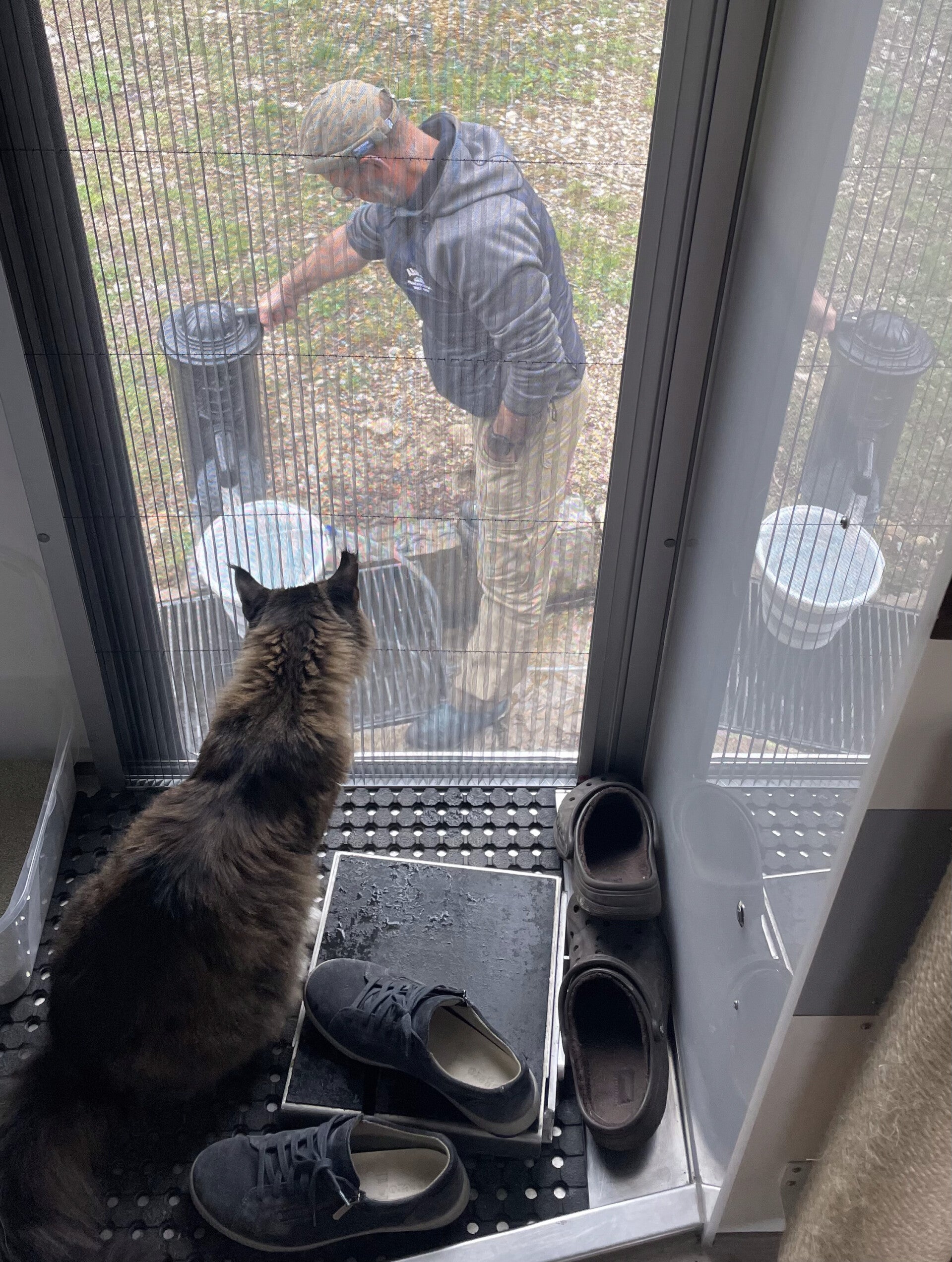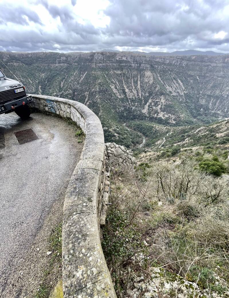 In Blandas angekommen, und auf die D713 (Route départementale) abgebogen, stehen wir plötzlich am Rand einer hohen Schlucht die von Karstfelsen umgeben ist. Am tiefsten Punkt liegt der kleine Ort Navacelles. Unter der Aufsicht von Kater Milo 🤓 füllen wir unsere Wassertanks auf. 😝