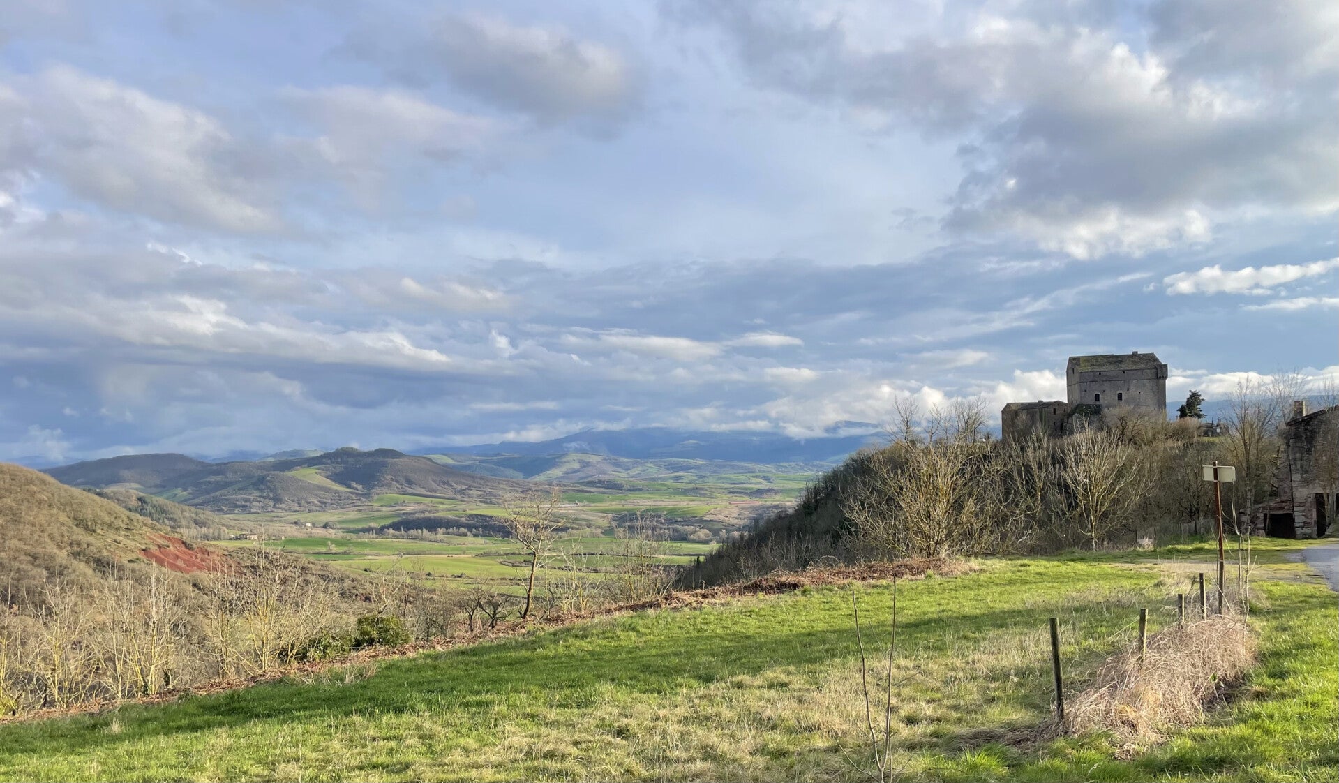 Martin navigiert weiter an steilen Abhängen entlang, auf schmalen Strassen, zwischen den Gebäuden der Bauernhöfe hindurch und die Strecke ist KEINE Abkürzung 😜, aber wie immer - es ist lustig. Die letzten Sonnenstrahlen des Tages genießen wir am Parkplatz beim Château de Montaigut mit Blick ins Tal.
