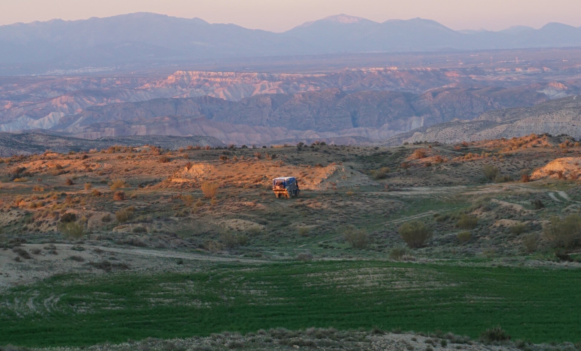 Die spannende Route führt uns hinunter in ein Flussbett, danach eine steile Piste wieder hinauf und über eine Kammstrasse zurück zur Ortschaft Gorafe. Wir treffen unzählige spanische Mountainbiker und Motorradfahrer und nur drei 4x4 Fahrzeuge, davon ein grosser MAN-KAT LKW mit einem jungen Briten und seinem Cocker-Pu 🤩. Wir hoffen er hat die engen Serpentinen entlang der Felswand meistern können🙏🏻.