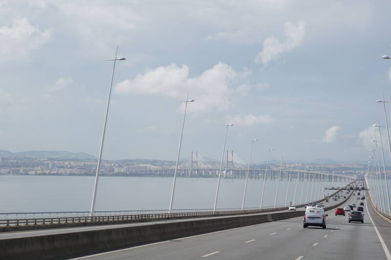Am Nachmittag bezahlen wir die Maut für die Vasco-da-Gama-Brücke nach Lissabon. Die Brücke ist offiziell mit 17,2 km die zweitlängste Brücke in Europa. Die maximale Spannweite beträgt 420 Meter, die Pylone sind 155 Meter hoch und die Brücke hat sechs Fahrstreifen und führt über den Fluss Tajo.