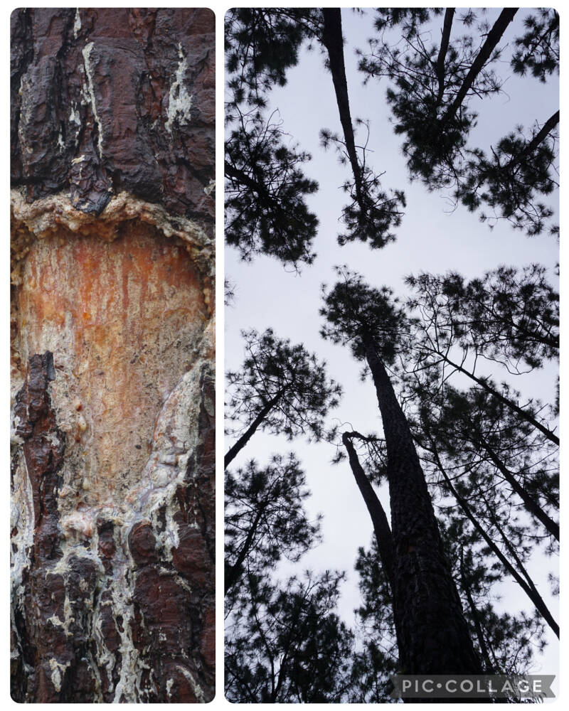 Portugal hat Ende des 19 Jahrhundert damit begonnen im grossen Stil Eukalyptus Plantagen für die Papierindustrie anzupflanzen und zu bewirtschaften. Der schnellwachsende Eukalyptus verdrängt andere heimische Arten. Die tiefen Wurzeln und der enorme Wasserverbrauch hat in gewissen Gebieten zur Absenkung des Grundwasserspiegels geführt. Die enthaltenen ätherischen Öle lieben nur Koalas 🐨 aber keine anderen Tiere 🐦⬛🐇🦌, und bricht erstmal ein Feuer aus in den Plantagen, ist es nur sehr schwer zu löschen. Portugal versucht nun vermehrt wieder Mischwälder zu pflanzen mit Kiefernarten und Korkeichen. Die bei unserem Rundgang entdeckten Schwarz-Kiefern, die zur Harzgewinnung genutzt werden, tragen hier wohl eher wenig bei - Harz brennt bekanntlich auch sehr gut 🙈.