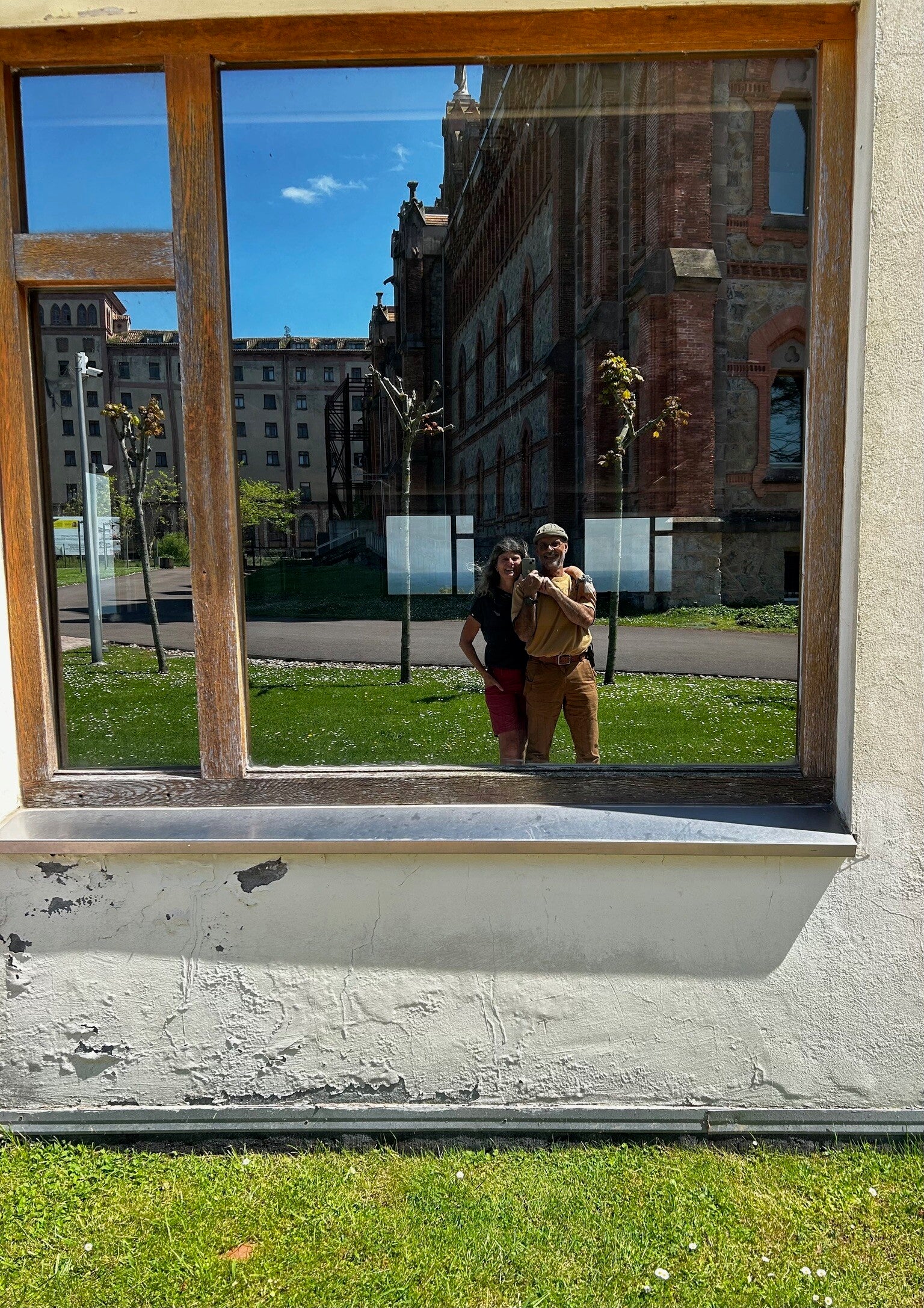 Unser Spiegelbild vor einem Nebengebäude mit den beiden Fenstern mit "Durchblick ans Meer".